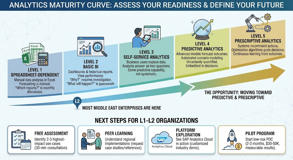 Where are you today? Most Middle East enterprises are at Level 2 (BI) with some moving into Level 3 (self-service). The opportunity is moving toward Levels 4-5 (predictive and prescriptive).