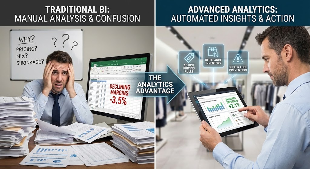 Advanced analytics analyzes millions of transaction records across all 50 stores to identify margin drivers. Using unsupervised learning and pattern recognition, it discovers: