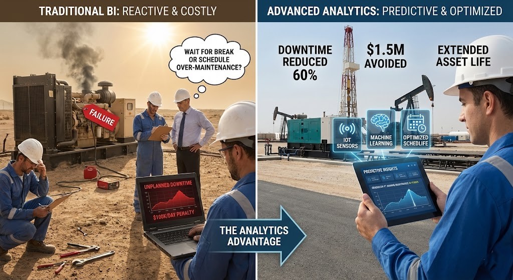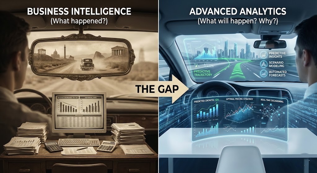 Your BI system tells you what happened. Advanced analytics tells you what will happen and what to do. Both matter. Most Middle East enterprises today have the first without the second.