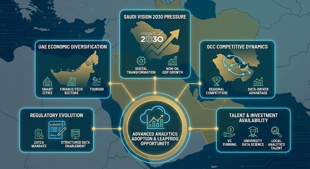 Advanced analytics adoption isn’t happening in a vacuum. Several powerful regional trends are pushing Middle East enterprises toward data-driven decision-making: