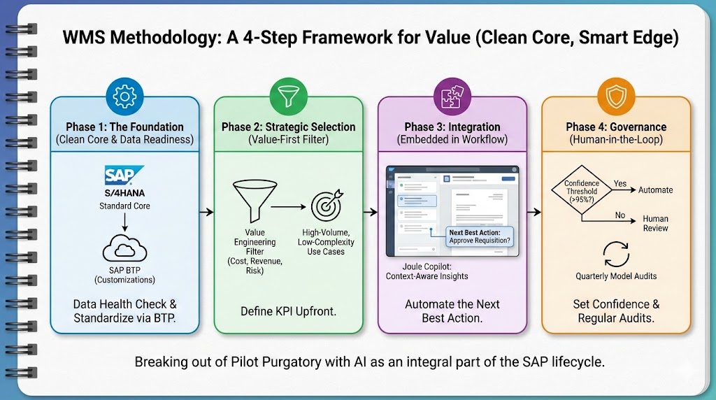 For Enterprise CTOs and Data Officers, the challenge isn’t buying AI technology; SAP has already embedded it into S/4HANA. The challenge is implementing the methodology that turns that technology into business value. Without a structured framework, AI becomes just another expensive shadow IT project—risky, ungoverned, and impossible to scale.